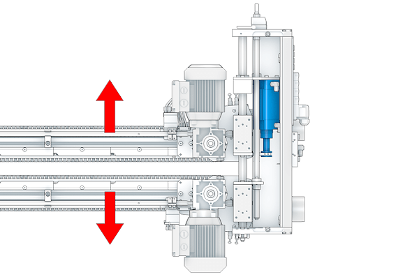 Szükség esetén a pneumatikus hengerek azonnal megemelik a Schwertbürste® kefét a szalagról. Ez megakadályozza a polírozó hatást, és lehetővé teszi, hogy a toldási vagy hibás szakaszok sérülés nélkül haladjanak át a Cevomat® berendezésen. A pneumatikus magasságállításnak köszönhetően a tekercscsere (coil-váltás) is gyorsan és egyszerűen elvégezhető.