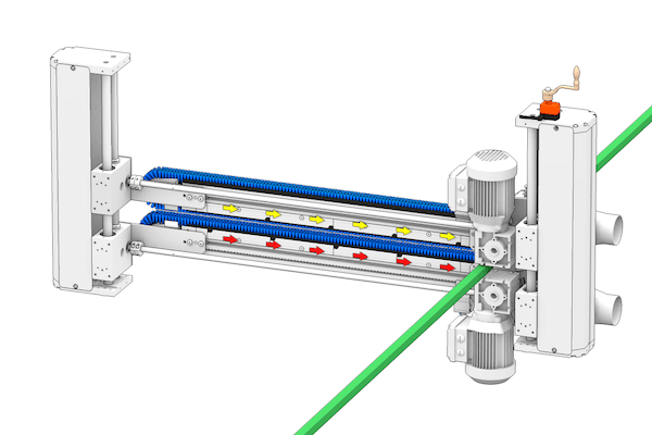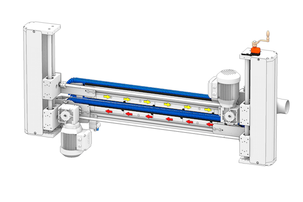 A Sword Brush® mindig a szállítási irányra merőlegesen töröl. Kétszintes paneltisztításnál a keféket egy közös vezetősínre szerelik, hogy mindkét oldal ugyanabba az irányba töröljön.