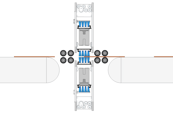 A szállítókazetta be- és kilépő oldalán hajtott, rugós felfüggesztésű szállító- és leszorítóhengerek gondoskodnak a kis méretű alkatrészek pontos és biztonságos továbbításáról a tisztítórendszeren keresztül. Így akár névjegykártya-méretű lemezek is kétoldalúan megtisztíthatók a PCL-Cleaner segítségével.