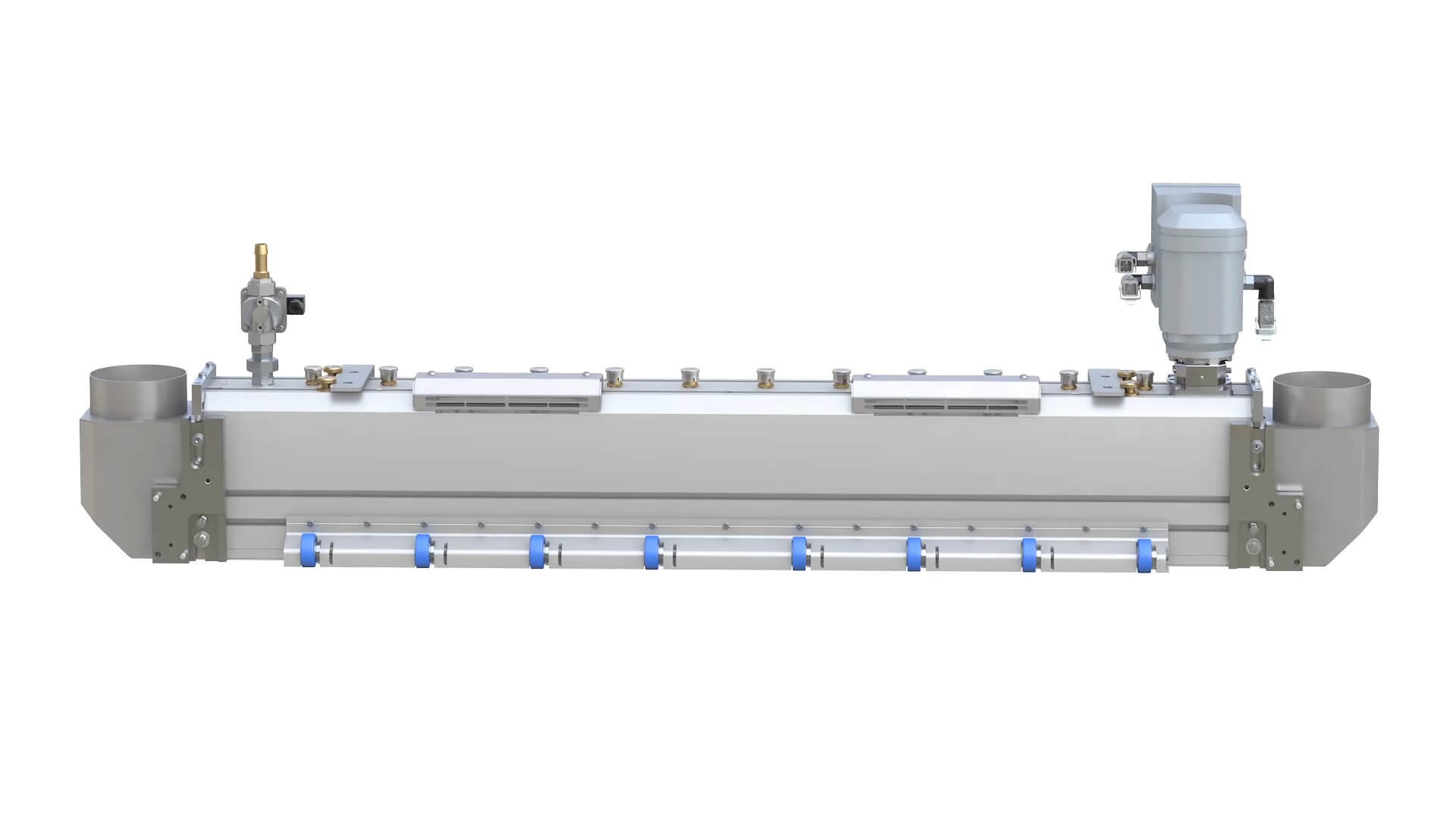 A tisztítófúvókák U alakú alumínium profilra vannak felszerelve, előre meghatározott távolságokban. A csatorna be- és kilépő oldalán légterelők és vezetőhengerek találhatók. A légterelők megakadályozzák, hogy a rendszer felesleges levegőt szívjon be, a vezetőhengerek pedig a paneleket a megfelelő pozícióban tartják, és biztosítják az optimális távolságot a tisztítandó felület és a fúvókák között.