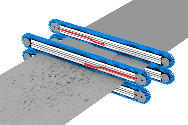 Az anyag tisztítását négy lineáris kefe végzi: két kefe felülről, két kefe alulról tisztít. A lineáris keféket az anyag széleinél kissé megemelik, és a felületet csak az él átlépése után érintik újra. Ez megakadályozza a szélek meggyűrődését vagy sérülését, és biztosítja, hogy a kefék a szélek felé szépen kisimítsák az anyagot. A kefepárok egymással ellentétes irányba törölnek, így a tekercs teljes szélessége egyenletesen és hatékonyan megtisztul.